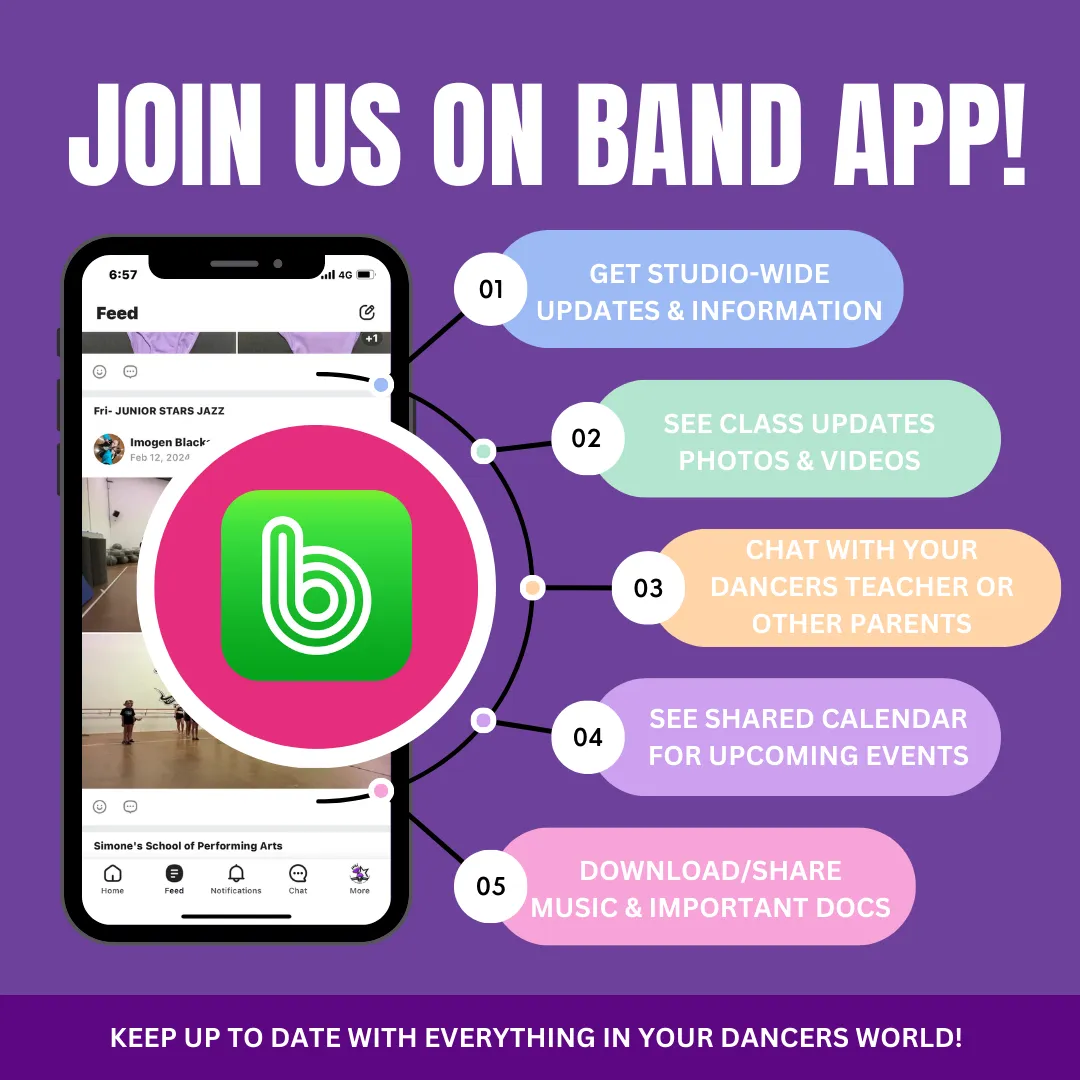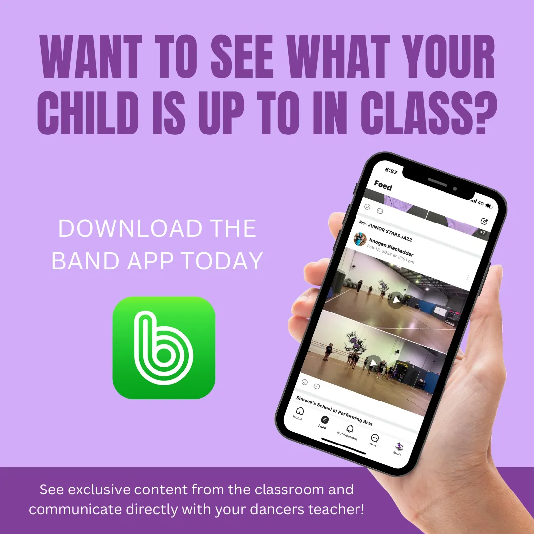 At Simone's School of Performing Arts we use BAND APP so you can receive studio updates, class info, ask questions, and see videos and photos from your Child's classes. We'll post relevant and important class updates as well as showing you what your kids are up to in class, you can also access class music and choreography allowing your child to easily practice their routines at home.